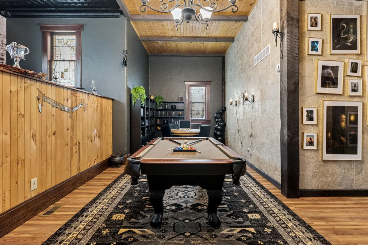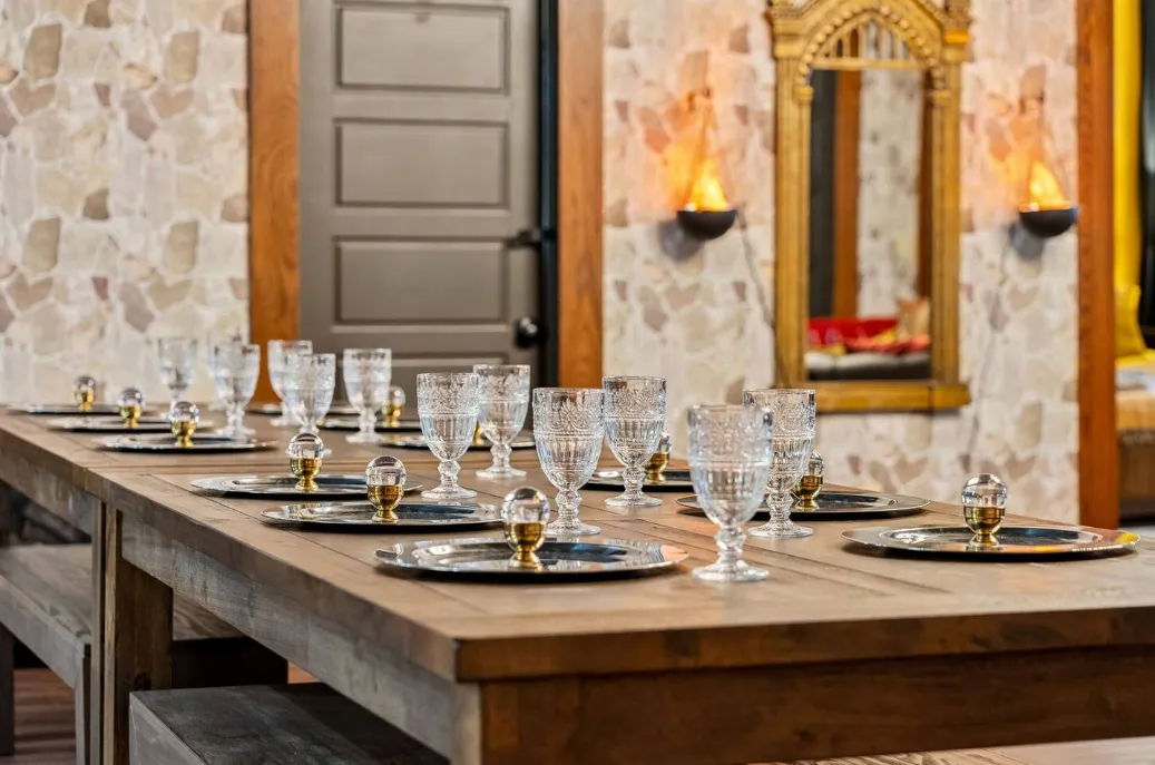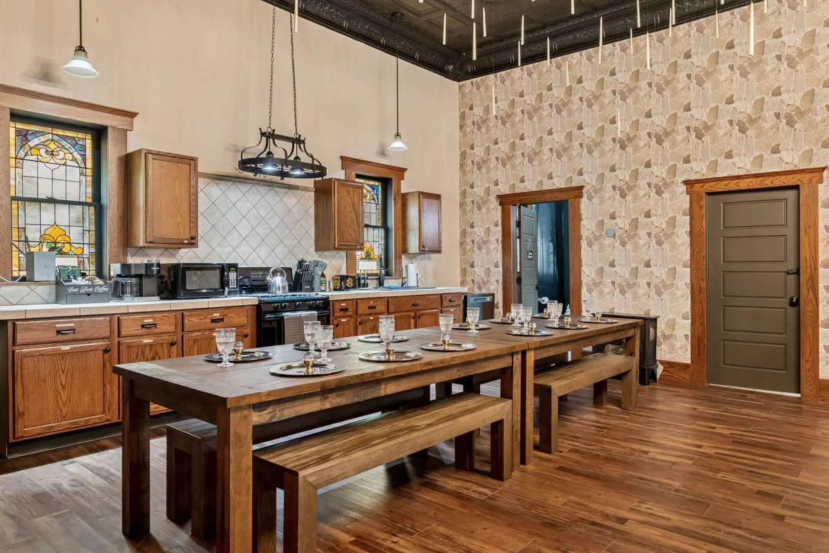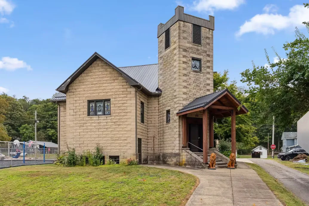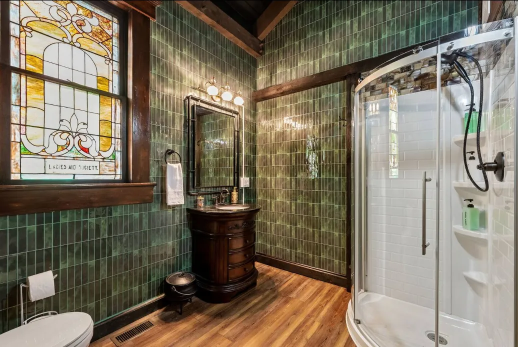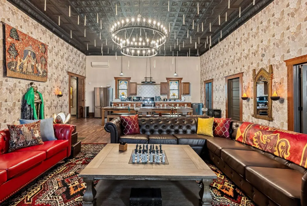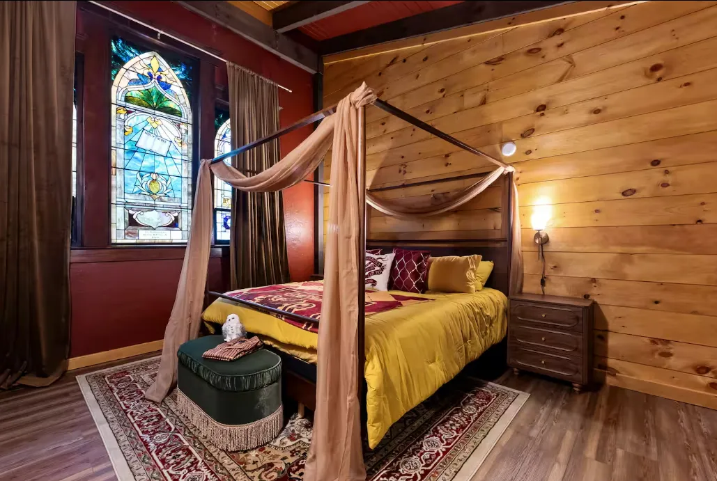 Sleeps 12 guests across 4 enchanted chambers and 3 full baths, inside a historic 1911 stone castle with its original bell tower and stained-glass windows.