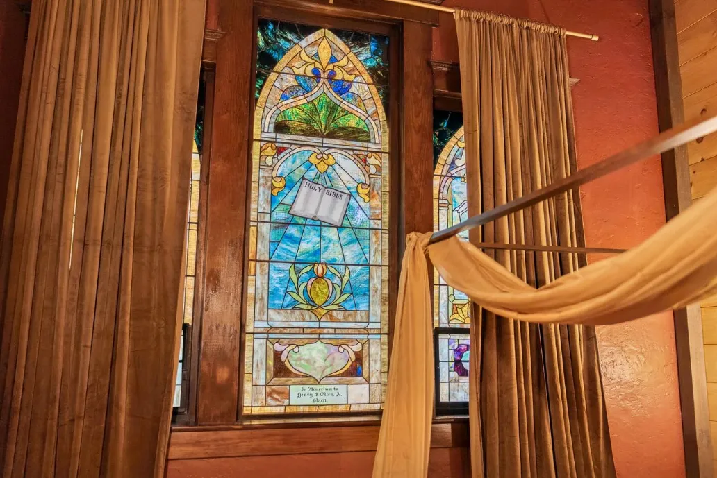 Built in 1911 from timbers of an 1800s church, complete with its historic bell tower and stained glass.